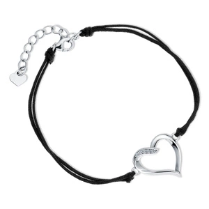 Srebrna pr.925 bransoletka z podwójnym czarnym sznurkiem - serce z cyrkoniami