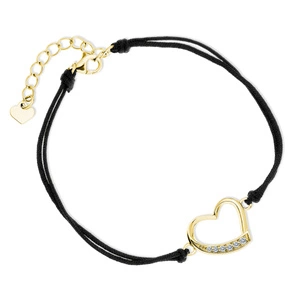 Srebrna pr.925 pozłacana bransoletka z podwójnym czarnym sznurkiem - serce z cyrkoniami