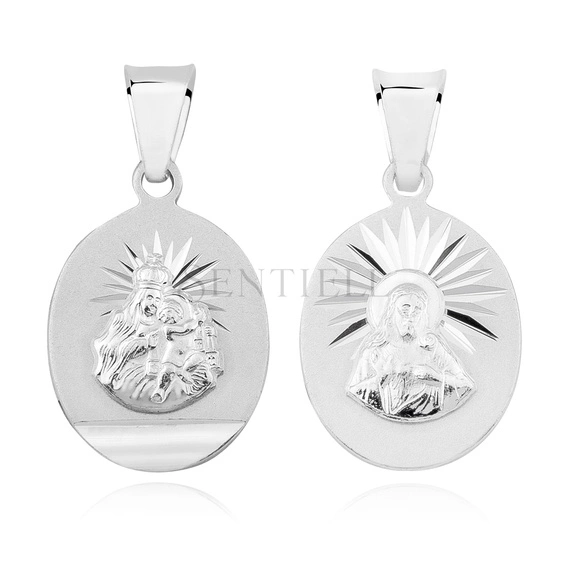 Dwustronny medalik wykonany ze srebra próby 925, o wymiarach 22 x 11 mm, w klasycznej formie owalnej. Awers przedstawia wizerunek Matki Boskiej Szkaplerznej z Dzieciątkiem, wykonany w wyraźnym reliefie i osadzony na tle z promienistym diamentowaniem. Rewers zdobiony jest wizerunkiem Jezusa z aureolą, również wykonanym w reliefie, na tle z symetrycznie rozchodzącymi się diamentowanymi promieniami. Dolna część medalika posiada gładką, poziomą płaszczyznę porządkującą kompozycję. Powierzchnia łączy satynowane tło z polerowanymi i diamentowanymi detalami, całość pokryta warstwą rodu nadającą jednolity srebrzysty kolor. Zawieszka wyposażona w standardową krawatkę.