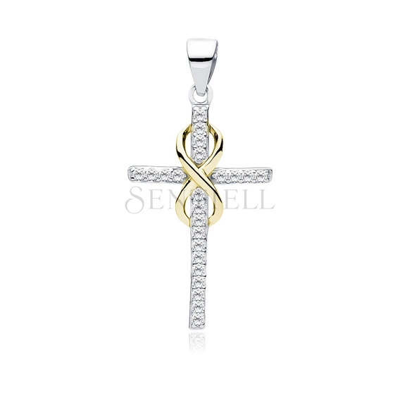 Srebrny pr. 925 krzyżyk z cyrkoniami i pozłacanym motywem nieskończoności 33 × 16 mm