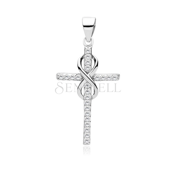Srebrny pr. 925 krzyżyk rodowany z cyrkoniami i motywem nieskończoności 33 x 16 mm