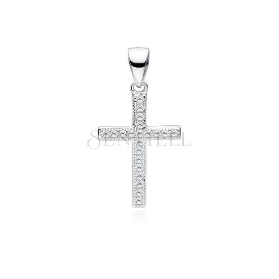 Zawieszka w formie krzyżyka wykonana ze srebra pr. 925, pokryta warstwą rodu. Front tworzy równy, prosty kontur o delikatnie zaokrąglonych krawędziach, a całą powierzchnię ramion wypełniono białymi cyrkoniami osadzonymi techniką microsetting, co pozwala na ich gęste i symetryczne rozmieszczenie.
