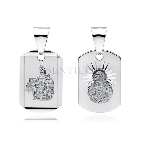 Dwustronny medalik w formie zawieszki wykonany ze srebra próby 925, o prostokątnym kształcie z zaokrąglonymi narożnikami i płaskim profilu. Awers przedstawia wypukły wizerunek Matki Boskiej Szkaplerznej w ujęciu frontalnym, osadzony centralnie na gładkiej, polerowanej powierzchni. Rewers zdobi wizerunek Jezusa z promienistym tłem opracowanym w technice diamentowania, tworzącym wyraźny kontrast z satynowym polem medalika. Reliefy obu stron są czytelne, z precyzyjnie zaznaczonymi detalami szat i twarzy. Powierzchnia całości wykończona w wysokim połysku i zabezpieczona warstwą rodu. Medalik ma proporcje 24 mm długości i 12 mm szerokości, wyposażony w standardową krawatkę.