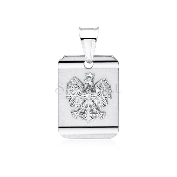 Medalik w formie zawieszki wykonany ze srebra próby 925, o prostokątnym kształcie z delikatnie sfazowanymi narożnikami i wyraźnie zaznaczoną górną oraz dolną krawędzią. Front przedstawia wypukły wizerunek orła w koronie, wykonany w płytkim reliefie, osadzony centralnie na matowanej powierzchni tła. Kontrast uzyskano poprzez diamentowane, polerowane pasy biegnące wzdłuż górnej i dolnej części medalika, nadające całości geometryczną strukturę. Relief orła jest precyzyjnie wyodrębniony, z czytelnymi detalami skrzydeł i korony. Powierzchnia srebra zabezpieczona warstwą rodu, stabilizującą kolor i ograniczającą utlenianie. Medalik ma proporcje 26 mm długości i 14 mm szerokości, wyposażony w standardową krawatkę.