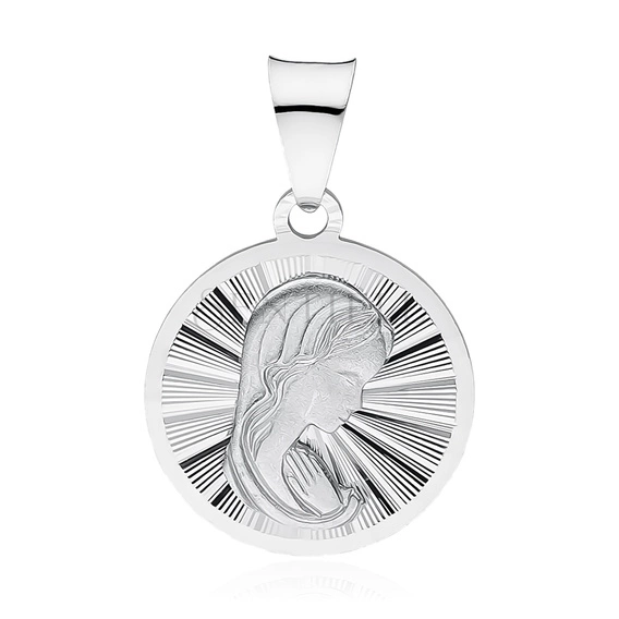Medalik w formie zawieszki wykonany ze srebra próby 925, o owalno-okrągłym obrysie z wyraźnie zaznaczoną ramką. Front przedstawia wizerunek Matki Boskiej Madonny w profilu, ujęty w centralnej części, z tłem diamentowanym promieniście, nadającym powierzchni kontrast i zróżnicowanie faktury. Relief postaci jest lekko wypukły, z matowo-satynowym wykończeniem, natomiast tło i krawędzie posiadają połysk uzyskany w procesie diamentowania. Medalik ma proporcje 26 mm długości i 17 mm szerokości, wyposażony w standardową krawatkę umożliwiającą montaż na łańcuszku. Powierzchnia srebra zabezpieczona jest warstwą rodu, co stabilizuje kolor i ogranicza utlenianie.