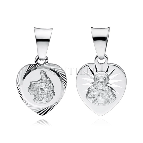 Dwustronny medalik w formie zawieszki wykonany ze srebra próby 925, z powierzchnią rodowaną. Forma serca o wymiarach 19 x 10 mm. Jedna strona przedstawia reliefowy wizerunek Matki Boskiej Szkaplerznej, osadzony na gładkim, częściowo satynowanym tle z diamentowanym, skrętnym wykończeniem krawędzi. Druga strona zdobiona wizerunkiem Jezusa z motywem Najświętszego Serca, wykonanym w wypukłym reliefie na tle z promienistym rysunkiem uzyskanym przez diamentowanie. Powierzchnie łączą wysoki połysk z matowymi akcentami, podkreślając czytelność detalu. Profil płaski, krawędzie równe, konstrukcja typowa dla niewielkich medalików dewocyjnych.