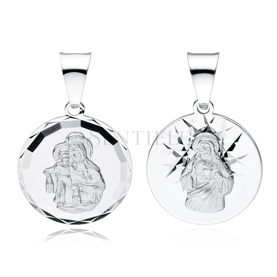 Dwustronny medalik w formie zawieszki wykonany ze srebra próby 925, z powierzchnią rodowaną, wykończoną w wysokim połysku oraz techniką diamentowania. Okrągła forma o wymiarach 26 x 17 mm. Jedna strona przedstawia reliefowy wizerunek Matki Boskiej Szkaplerznej z Dzieciątkiem, osadzony na gładkim tle, z wyraźnie fazowaną, diamentowaną krawędzią. Druga strona zdobiona wizerunkiem Jezusa z motywem Najświętszego Serca, wykonanym w wypukłym reliefie na tle z promienistym, diamentowanym rysunkiem. Zestawienie polerowanych płaszczyzn z ostrymi nacięciami diamentowanymi podkreśla czytelność detalu. Profil płaski, krawędzie równe, konstrukcja typowa dla medalika dewocyjnego.