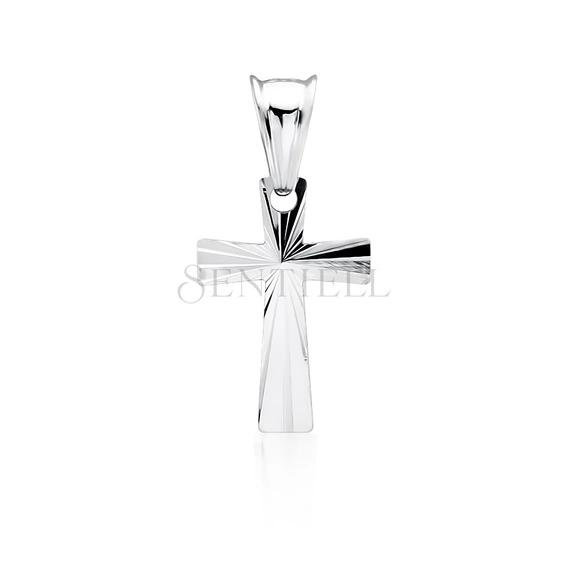 Zawieszka w formie krzyżyka wykonana ze srebra pr. 925, pokryta warstwą rodu. Na powierzchni ramion zastosowano diamentowanie tworzące promieniście rozchodzące się nacięcia, które akcentują centralny punkt przecięcia ramion. Dolna część pionowej osi jest lekko poszerzona i zwęża się ku górze.
