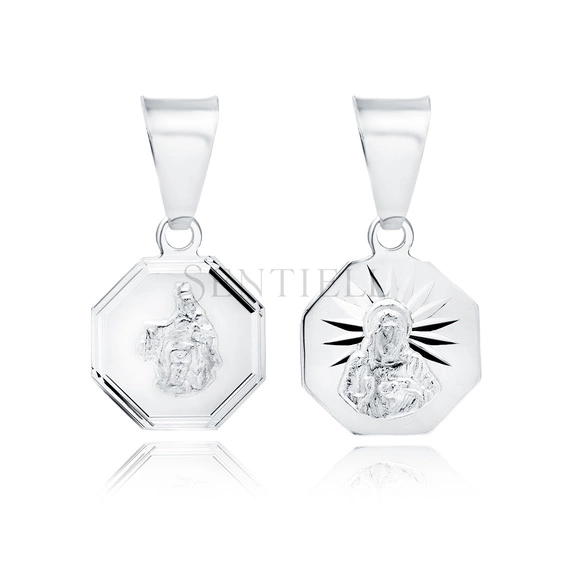 Dwustronny medalik wykonany ze srebra próby 925, pokryty warstwą rodu. Forma ośmiokątna z wyraźnie zaznaczonymi, fazowanymi krawędziami. Na jednej stronie wizerunek Matki Boskiej Szkaplerznej wykonany w wypukłym reliefie, osadzony w gładkim polu centralnym. Na drugiej stronie wizerunek Jezusa otoczony promienistym motywem uzyskanym techniką diamentowania. Powierzchnia w wysokim połysku, z czytelnym kontrastem pomiędzy gładkimi partiami a diamentowanymi nacięciami. Proporcje medalika wynoszą około 21 mm długości i 10 mm szerokości.