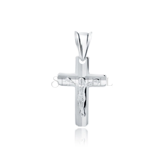 Zawieszka w formie krzyżyka wykonana ze srebra próby 925 i pokryta powłoką rodu ma wymiary 24 x 12 mm oraz wagę ok. 1,0 g. Ramiona posiadają polerowany front z delikatnym, liniowym diamentowaniem prowadzonym wzdłuż osi, a centralnie osadzona jest reliefowa sylwetka Chrystusa. Profil krzyżyka jest prosty i symetryczny, z lekko zaokrąglonymi krawędziami. Górna zawieszka o zwężającym się kształcie umożliwia montaż na cienkich łańcuszkach jubilerskich.