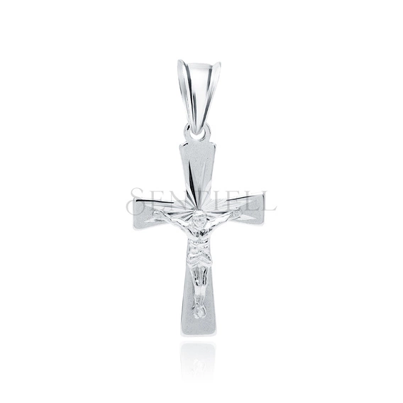 Zawieszka w formie krzyżyka wykonana ze srebra próby 925 i pokryta powłoką rodu ma wymiary 30 x 14 mm oraz wagę ok. 1,3 g. Front ramion wykończony jest w wysokim połysku, a centralne diamentowanie tworzy promienisty układ nacięć wychodzących ze środka. Na osi krzyża umieszczona jest reliefowa sylwetka Chrystusa, opracowana na gładkim tle. Krawędzie są lekko zaokrąglone, a górna zawieszka o zwężającym się profilu pozwala na montaż na standardowych łańcuszkach jubilerskich.