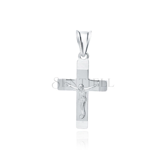 Zawieszka w formie krzyżyka wykonana ze srebra próby 925 i pokryta powłoką rodu ma wymiary 26 x 13 mm oraz wagę ok. 1,0 g. Front posiada gładką, polerowaną powierzchnię, z diamentowaniem umieszczonym na zakończeniach ramion w postaci równoległych nacięć. Centralnie odwzorowana jest reliefowa sylwetka Chrystusa, osadzona na płaskim tle. Krawędzie są proste i delikatnie zaokrąglone, a górna zawieszka o zwężającym się profilu umożliwia montaż na cienkich łańcuszkach jubilerskich.