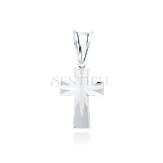Zawieszka w formie krzyżyka wykonana ze srebra próby 925 i pokryta powłoką rodu ma wymiary 24 x 11 mm oraz wagę ok. 1,0 g. Front ramion wykończony jest w wysokim połysku, a centralne diamentowanie tworzy wielokierunkowy układ nacięć rozchodzących się promieniście od środka, podkreślając geometryczny zarys krzyżyka. Krawędzie są gładkie i lekko zaokrąglone, a górna zawieszka o zwężonym profilu umożliwia montaż na cienkich łańcuszkach jubilerskich.