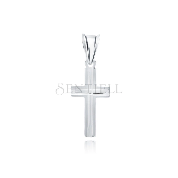 Zawieszka w formie klasycznego krzyżyka wykonana ze srebra próby 925 i pokryta powłoką rodu ma wymiary 26 x 10 mm oraz wagę ok. 0,8 g. Ramiona posiadają gładki, polerowany front z centralnym diamentowaniem w formie liniowego nacięcia biegnącego wzdłuż obu osi, co podkreśla symetrię kształtu. Krawędzie są proste i lekko zaokrąglone, a górna zawieszka o zwężonym profilu umożliwia montaż na cienkich łańcuszkach jubilerskich.