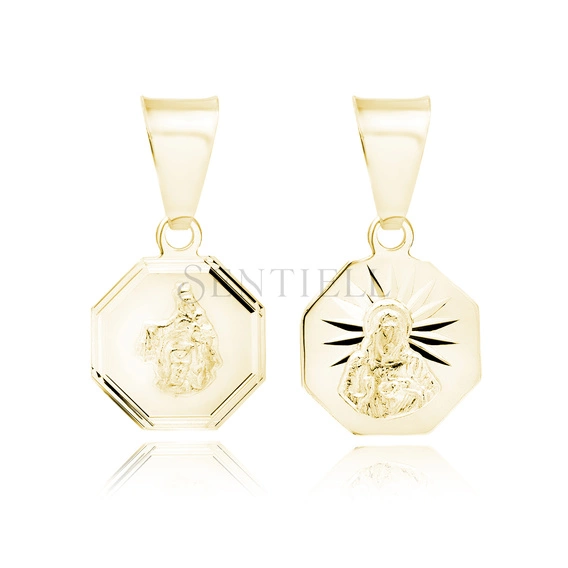 Dwustronny medalik wykonany ze srebra próby 925, pokryty warstwą 24K żółtego złota. Forma ośmiokątna z wyraźnie zaznaczonymi, fazowanymi krawędziami. Na awersie wizerunek Matki Boskiej Szkaplerznej w wypukłym reliefie, na rewersie wizerunek Jezusa otoczony promienistym motywem wykonanym techniką diamentowania. Powierzchnia w wysokim połysku, z kontrastem pomiędzy gładkim tłem a diamentowanymi nacięciami. Proporcje medalika wynoszą około 21 mm długości i 10 mm szerokości.