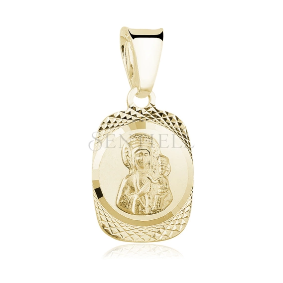 Medalik w formie zawieszki wykonany ze srebra próby 925, pokryty warstwą 24K żółtego złota w technologii e-coating. Korpus o prostokątnym obrysie z zaokrąglonymi narożnikami i płaskim profilu. Centralne pole satynowane, z wizerunkiem Matki Boskiej Częstochowskiej wykonanym w płytkim reliefie. Obrzeże szerokie, polerowane, z wyraźnym diamentowanym nacięciem o regularnej, geometrycznej strukturze, tworzącym kontrast z matowym tłem środka. Powierzchnie łączą wykończenie satynowane i diamentowane. Wymiary 10 x 20 mm.