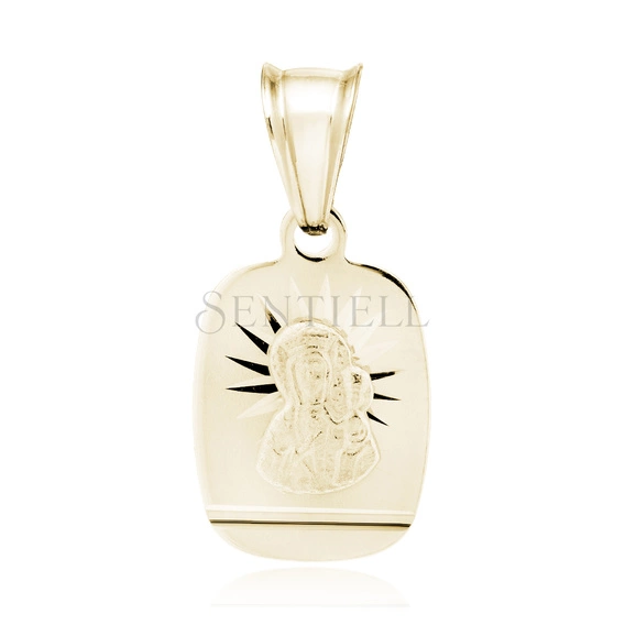 Medalik w formie zawieszki wykonany ze srebra próby 925, pokryty warstwą 24K żółtego złota w technologii e-coating. Forma podłużna z zaokrąglonymi krawędziami i płaskim profilem. Centralnie umieszczony wizerunek Matki Boskiej Częstochowskiej z Dzieciątkiem wykonany w płytkim reliefie, osadzony na gładkim tle. Za wizerunkiem widoczny promienisty motyw wykonany techniką diamentowania, kontrastujący z polerowaną powierzchnią. Dolna część medalika podkreślona prostą, poziomą linią nacięcia. Całość wykończona w wysokim połysku. Wymiary 10 x 21 mm, produkcja Polska.