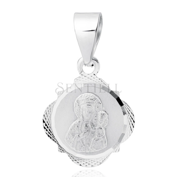 Medalik w formie zawieszki wykonany ze srebra próby 925, pokryty warstwą rodu. Centralnie umieszczony wizerunek Matki Boskiej Częstochowskiej wykonany w płytkim reliefie, osadzony na jednolitym, satynowanym tle. Krawędź medalika profilowana, wielopłaszczyznowa, z regularnym diamentowanym nacięciem tworzącym dekoracyjny obrys wokół pola centralnego. Powierzchnie wykończone w wysokim połysku z wyraźnym kontrastem pomiędzy gładkimi i diamentowanymi fragmentami. Wymiary 13 x 21 mm, produkcja Polska.