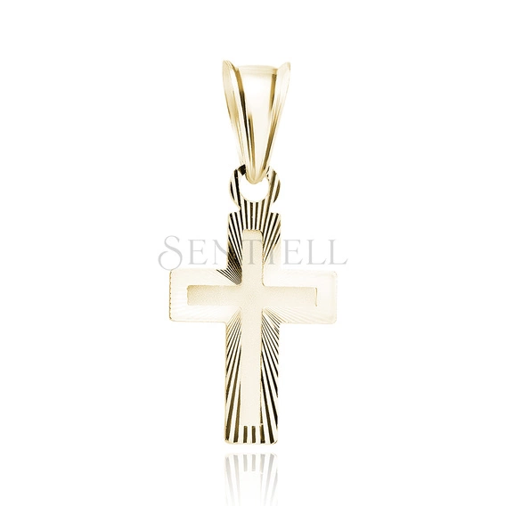 Zawieszka w formie krzyżyka wykonana ze srebra pr. 925 pokrytego 24-karatowym złotem metodą e-coating. Model o długości 22 mm i szerokości 10 mm łączy satynowaną powierzchnię z precyzyjnym diamentowaniem. Centralna część krzyża jest satynowa, z gładko wyciętym konturem krzyża. Tło wokół ramion zdobią charakterystyczne, promieniste nacięcia wykonane techniką diamentowania, które podkreślają geometryczną formę zawieszki. Całość uzupełnia klasyczna, zamknięta krawatka.
