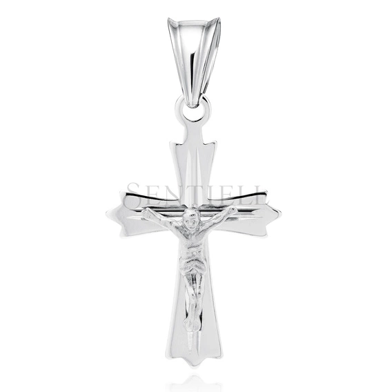 Zawieszka w formie krzyżyka wykonana ze srebra pr. 925 z powłoką rodu. Model o wymiarach 33 mm × 17 mm charakteryzuje się ramionami zakończonymi geometrycznymi, wielokątnymi krawędziami oraz ozdobnymi, diamentowanymi żłobieniami biegnącymi wzdłuż ramion. W centralnej części umieszczono wypukłą figurę Chrystusa o gładkim, polerowanym wykończeniu, osadzoną na połyskującej powierzchni krzyża. Całość uzupełnia zamknięta, gładko wykończona krawatka przystosowana do standardowych łańcuszków.