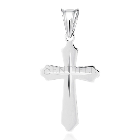 Zawieszka w formie krzyżyka wykonana ze srebra pr. 925, pokryta warstwą rodu. Model o wymiarach 30 mm na 14 mm ma pełny, płaski korpus z prostymi ramionami zakończonymi lekko poszerzonymi, geometrycznymi końcówkami. W centralnej części ramion wykonano diamentowanie w formie czterokierunkowego nacięcia biegnącego wzdłuż osi pionowej i poziomej. Powierzchnia krzyżyka jest gładka i polerowana, a zamknięta krawatka została wyprofilowana do standardowych łańcuszków jubilerskich.