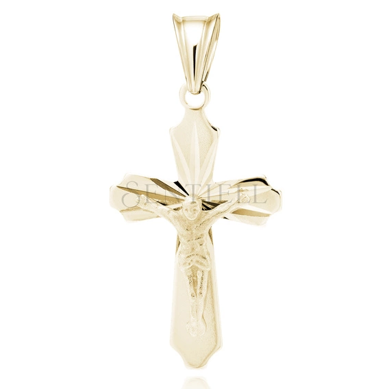 Zawieszka w formie krzyżyka wykonana ze srebra pr. 925 i pokryta powłoką 24K żółtego złota (e-coating). Model o wymiarach 30 mm na 14 mm ma pełny korpus z lekko poszerzonymi, geometrycznymi zakończeniami ramion. Na górnym oraz bocznych ramionach zastosowano diamentowanie w formie promienistych nacięć biegnących od centralnej osi. W centralnej części umieszczono wypukły wizerunek Chrystusa. Powierzchnia pozostaje polerowana, a zawieszka wyposażona jest w zamkniętą, wyprofilowaną krawatkę kompatybilną ze standardowymi łańcuszkami jubilerskimi.