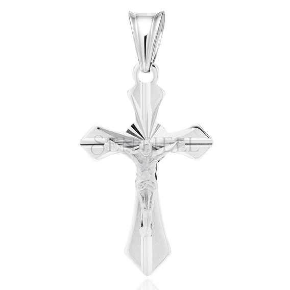 Zawieszka w formie krzyżyka wykonana ze srebra pr. 925 i pokryta warstwą rodu. Model o wymiarach 32 mm na 16 mm ma pełny korpus z ramionami zakończonymi geometrycznymi, fazowanymi płaszczyznami. Górna część krzyżyka zawiera strefę diamentowania o promienistym układzie, kontrastującą z gładkimi, polerowanymi powierzchniami pozostałych elementów. Na centralnym polu umieszczony jest trójwymiarowy relief Chrystusa osadzony na pionowym ramieniu. Zawieszka wyposażona jest w zamkniętą, polerowaną krawatkę kompatybilną ze standardowymi łańcuszkami jubilerskimi.