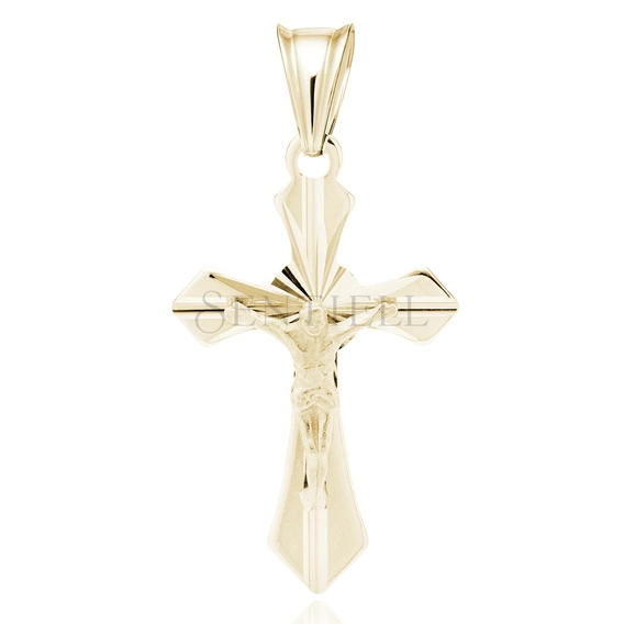 Zawieszka w formie krzyżyka wykonana ze srebra pr. 925 i pokryta powłoką z 24-karatowego żółtego złota (e-coating). Model o wymiarach 32 mm na 16 mm ma pełny korpus z ramionami zakończonymi geometrycznymi, fazowanymi płaszczyznami. W górnej części umieszczono strefę diamentowania o promienistym układzie, wyraźnie kontrastującą z gładką powierzchnią pozostałych elementów. Na centralnym polu osadzony jest trójwymiarowy relief Chrystusa na krzyżu. Krawatka ma zamknięty profil i polerowane wykończenie, umożliwiające montaż na standardowych łańcuszkach jubilerskich.