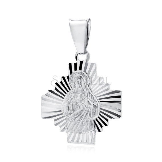 Medalik wykonany ze srebra pr. 925 z powłoką rodowaną. Element ma formę geometrycznej, krzyżowej płytki o wymiarach 15 x 23 mm, z centralnym wizerunkiem Jezusa na matowym reliefie. Tło stanowią promieniste, wysoko polerowane żłobienia podkreślające symetrię konstrukcji. Krawatka w standardowym rozmiarze umożliwia montaż na typowych łańcuszkach jubilerskich. Waga zawieszki wynosi około 2,3 g.