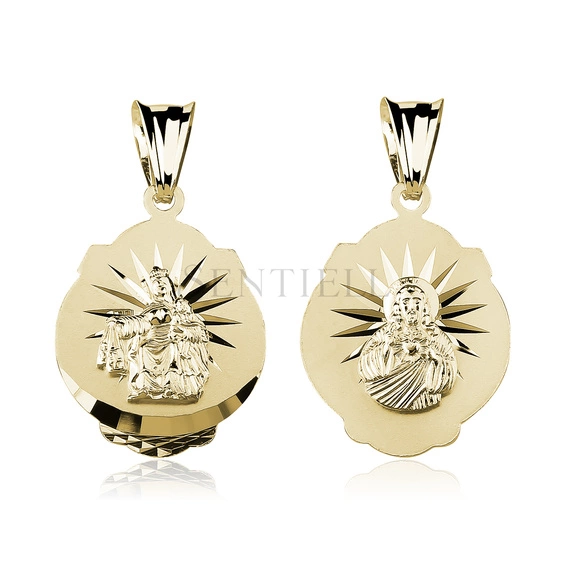 Dwustronny medalik wykonany ze srebra pr. 925, pokryty warstwą złota 24K w technologii e-coating. Element ma formę owalnej, lekko profilowanej blaszki o wymiarach 26 x 15 mm, z wyraźnie zarysowaną krawędzią i diamentowanym wykończeniem tworzącym promienisty efekt wokół obu wizerunków. Jedna strona przedstawia Jezusa, druga Matkę Boską Szkaplerzną. Powierzchnia jest gładka z miejscami polerowanymi, typowymi dla obróbki diamentowej. Krawatka w standardowym rozmiarze umożliwia montaż na typowych łańcuszkach jubilerskich. Całość ma wagę ok. 2,4 g.