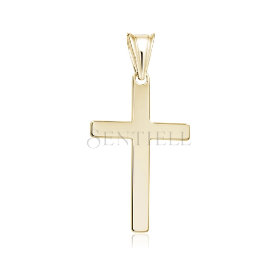 Zawieszka w formie krzyżyka wykonana ze srebra pr. 925 i pokryta powłoką z 24-karatowego żółtego złota (e-coating). Model o wymiarach 30 mm na 14 mm ma pełny, gładki korpus z prostymi, równoległymi ramionami o zaokrąglonych krawędziach. Pionowe ramię jest wyraźnie wydłużone, zachowując jednolity prostokątny profil na całej długości. Powierzchnia wykończona jest w wysokim połysku. Zawieszka posiada zamkniętą, polerowaną krawatkę dopasowaną do standardowych łańcuszków jubilerskich.