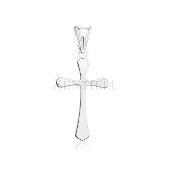Zawieszka w formie krzyżyka wykonana ze srebra pr. 925 i pokryta warstwą rodu. Model o wymiarach 28 mm na 13 mm ma pełny, gładki korpus z lekko wygiętymi, zwężającymi się ramionami, które zakończone są delikatnie zaokrąglonymi, poszerzonymi końcówkami. Dolna część pionowego ramienia przechodzi w charakterystyczny, pięciokątny kształt. Powierzchnia wykończona jest w wysokim połysku, a krawędzie pozostają gładkie i równe. Zawieszka wyposażona jest w zamkniętą krawatkę o polerowanym wykończeniu, dostosowaną do standardowych łańcuszków jubilerskich.