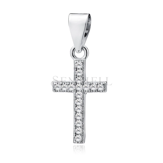 Zawieszka w formie krzyżyka wykonana ze srebra pr. 925 z powierzchnią pokrytą warstwą rodu. Model o wymiarach 20 x 9 mm ma smukły korpus o prostokątnym profilu ramion. Wzdłuż pionowego i poziomego ramienia osadzono jednolity rząd białych cyrkonii o tej samej średnicy, tworzących ciągłe liniowe wypełnienie. Powierzchnia metalu w strefie oprawy ma delikatną fakturę, podczas gdy krawędzie pozostają gładkie i polerowane. Zawieszka wyposażona jest w zamkniętą, gładką krawatkę przystosowaną do standardowych łańcuszków jubilerskich.