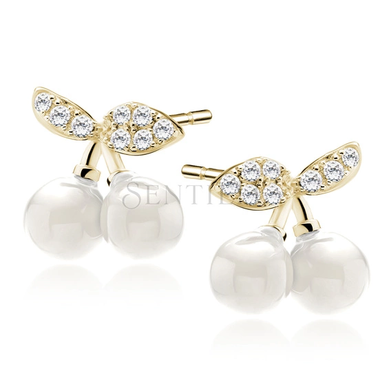 Srebrne, pozłacane kolczyki pr. 925 - wisienka z białymi cyrkoniami i perłą