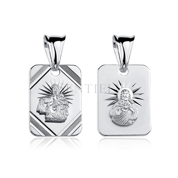Dwustronny medalik wykonany ze srebra próby 925, o wymiarach 28 x 14 mm, w formie prostokątnej z zaokrąglonymi narożnikami i wyraźnie zaznaczonym profilem krawędzi. Awers przedstawia wizerunek Matki Boskiej Szkaplerznej w wypukłym reliefie, umieszczony na gładkim tle z promienistym motywem diamentowanym oraz dodatkowymi liniami dekoracyjnymi w narożnikach. Rewers zawiera wizerunek Jezusa z Najświętszym Sercem w reliefie, osadzony na gładkiej powierzchni z promienistymi nacięciami diamentowanymi wychodzącymi z centralnej części. Całość została pokryta warstwą rodu, nadając jednolite srebrzyste wykończenie i podkreślając kontrast pomiędzy gładkimi a zdobionymi partiami powierzchni.