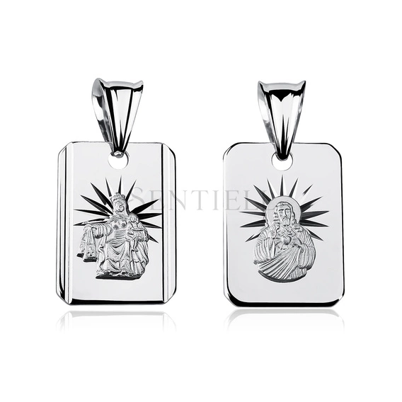 Dwustronny medalik wykonany ze srebra próby 925, o wymiarach 28 x 14 mm, w formie prostokątnej z delikatnie zaokrąglonymi narożnikami i wyraźnie zaznaczonym profilem krawędzi. Awers przedstawia wizerunek Matki Boskiej Szkaplerznej w wypukłym reliefie, osadzony na gładkim tle z promienistym motywem uzyskanym poprzez diamentowanie. Rewers ukazuje wizerunek Jezusa z Najświętszym Sercem, również wykonany w reliefie, z analogicznym układem promienistych nacięć w tle. Cała powierzchnia medalika została rodowana, co nadaje jednolite, srebrzyste wykończenie i podkreśla detale obydwu przedstawień.