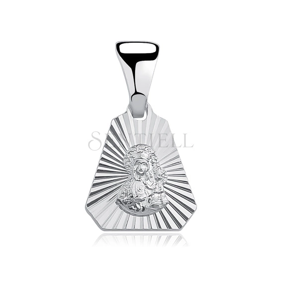 Medalik wykonany ze srebra próby 925, rodowany, o wielobocznej formie z wyraźnie zaznaczonymi krawędziami. Front wypełniony promienistym diamentowaniem rozchodzącym się wachlarzowo od centralnej części ku obrzeżom. W środku umieszczony wypukły wizerunek Matki Boskiej Częstochowskiej z Dzieciątkiem, wyraźnie oddzielony od tła. Powierzchnia pełna, zróżnicowana fakturowo, łącząca polerowane płaszczyzny z matowymi partiami diamentowanymi. Proporcje zwarte, forma symetryczna, przeznaczona do zastosowań jubilerskich.