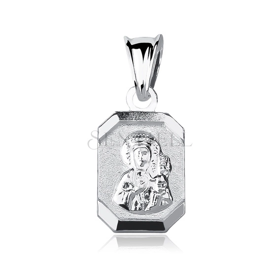 Medalik o niewielkiej, prostokątnej formie z ściętymi narożnikami wykonany ze srebra próby 925, rodowany. Centralnie umieszczony wizerunek Matki Boskiej Częstochowskiej z Dzieciątkiem wykonany w wypukłym reliefie, osadzony na pełnym, drobno fakturowanym tle. Obramowanie wyraźnie zaznaczone, gładkie i polerowane, kontrastujące z matową powierzchnią wnętrza. Profil płaski, forma zwarta i symetryczna, charakterystyczna dla klasycznych medalików dewocyjnych.