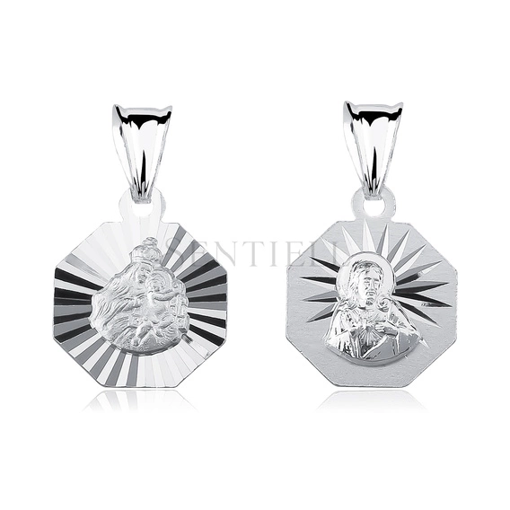 Dwustronny medalik o wielobocznej, symetrycznej formie wykonany ze srebra próby 925, rodowany. Jedna strona przedstawia wizerunek Matki Boskiej Szkaplerznej w wypukłym reliefie, osadzony centralnie na tle z promienistym, diamentowanym wykończeniem rozchodzącym się ku krawędziom. Druga strona ukazuje wizerunek Jezusa z Sercem w reliefie, umieszczony na satynowanej powierzchni z promienistym motywem wykonanym techniką diamentowania. Krawędzie regularne, profil płaski, proporcje zwarte i technicznie spójne.
