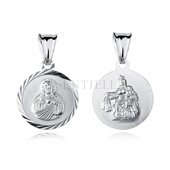 Dwustronny medalik o okrągłej formie wykonany ze srebra próby 925, rodowany. Jedna strona przedstawia wizerunek Jezusa z Sercem w wypukłym reliefie, osadzony na satynowanym tle, z obwodem wykończonym diamentowaniem tworzącym regularny, skrętny rant. Druga strona ukazuje wizerunek Matki Boskiej Szkaplerznej w reliefie, z wyraźnie zaznaczonymi detalami szat, umieszczony na satynowanej powierzchni. Krawędzie równe, profil płaski, proporcje zwarte i symetryczne.