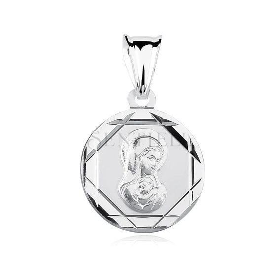 Okrągły medalik wykonany ze srebra próby 925, rodowany. Centralnie umieszczony wizerunek Matki Boskiej Madonna z Dzieciątkiem przedstawiony w wypukłym reliefie, z delikatnie zaznaczonymi rysami twarzy i fałdami szat. Tło gładkie, obwód medalika wykończony regularnym diamentowaniem tworzącym geometryczny, fasetowany rant. Profil płaski, krawędzie równe, proporcje zwarte i symetryczne.