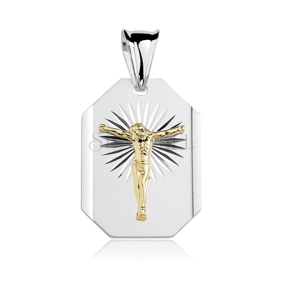 Medalik w formie zawieszki wykonany ze srebra próby 925 o wymiarach 33 x 17 mm. Płytka o wydłużonym, wielokątnym kształcie z fazowanymi narożnikami posiada gładkie, satynowane tło wykończone w rodzie. Centralnie umieszczony wizerunek Jezusa na krzyżu został wykonany w wyraźnym reliefie i pokryty warstwą 24K żółtego złota. Strefa krzyża podkreślona promienistym diamentowaniem, tworzącym kontrast z matową powierzchnią tła. Krawędzie precyzyjnie wyprowadzone, profil płaski z lokalnym podniesieniem części centralnej. Zawieszka wyposażona w standardową krawatkę.