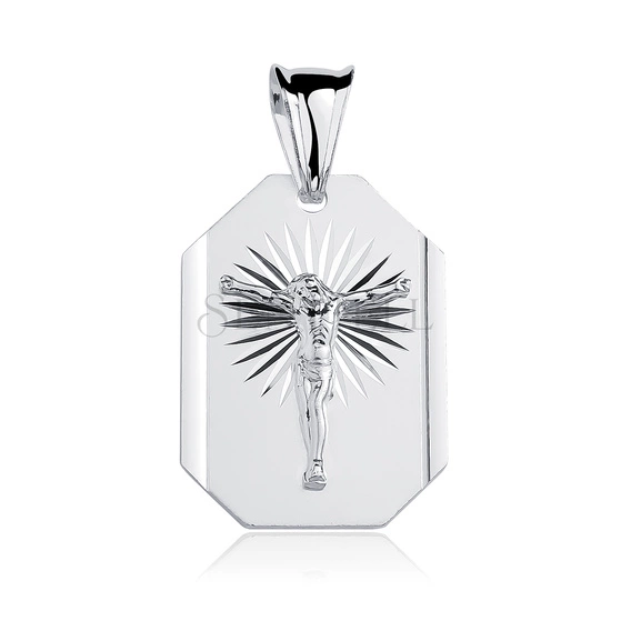 Medalik w formie zawieszki wykonany ze srebra próby 925 o wymiarach 33 x 17 mm. Płytka o wydłużonym, wielokątnym kształcie z fazowanymi narożnikami ma gładkie, satynowane tło. Centralnie umieszczony wizerunek Jezusa na krzyżu został wykonany w wyraźnym reliefie, z promieniście rozchodzącym się diamentowaniem podkreślającym strefę krzyża. Kontrast pomiędzy satynowaniem a ostrym cięciem diamentowym nadaje powierzchni czytelną strukturę. Całość wykończona w rodzie, z precyzyjnie wyprowadzonymi krawędziami i płaskim profilem. Medalik wyposażony w standardową krawatkę.