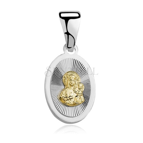 Owalny medalik w formie zawieszki wykonany ze srebra próby 925 o wymiarach 22 x 10 mm. Centralny wizerunek Matki Boskiej Częstochowskiej został wyraźnie wypukły i pokryty warstwą 24K żółtego złota, osadzony na tle opracowanym promienistym diamentowaniem. Zewnętrzna ramka ma gładką, satynowaną powierzchnię w wykończeniu rodowanym, tworząc czytelny kontrast technologiczny pomiędzy poszczególnymi strefami medalika. Obrzeże o zamkniętym, regularnym profilu z precyzyjnie wyprowadzonymi krawędziami. Medalik posiada płaski profil z delikatnym podniesieniem części centralnej oraz standardową krawatkę.