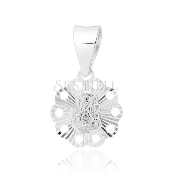 Medalik w formie zawieszki wykonany ze srebra próby 925 o wymiarach 18 x 11 mm. Centralnie umieszczony wizerunek Matki Boskiej Częstochowskiej został wyraźnie wypukły i utrzymany w jednolitej kolorystyce srebra z rodowaną powierzchnią. Tło ma ażurową konstrukcję z regularnie rozmieszczonymi otworami oraz promienistym diamentowaniem, które podkreśla kontur i nadaje powierzchni wyraźną strukturę. Obrzeże o falistym profilu z precyzyjnie wyprowadzonymi krawędziami. Medalik posiada płaski profil z delikatnym podniesieniem części centralnej i standardową krawatkę.