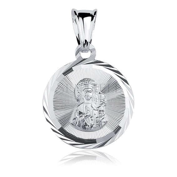 Medalik wykonany ze srebra próby 925 w formie okrągłej o wymiarach 21 x 13 mm. Centralnie umieszczony relief Matki Boskiej Częstochowskiej z Dzieciątkiem jest integralną częścią srebrnej powierzchni i wyraźnie odcinia się od tła dzięki zróżnicowanej głębokości reliefu. Tło medalika opracowane techniką diamentowania, tworząc gęsty, promienisty układ nacięć skupionych wokół wizerunku. Zewnętrzny pierścień również diamentowany, z naprzemiennym kierunkiem szlifów, co podkreśla obrys formy i nadaje jej techniczny charakter. Powierzchnia zabezpieczona warstwą rodu. Zawieszka z krawatką o standardowych proporcjach.