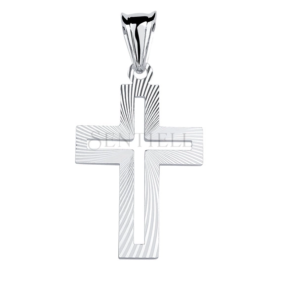 Zawieszka w formie krzyżyka wykonana ze srebra pr. 925, o wymiarach ok. 40 x 20 mm i przybliżonej wadze 1,8 g. Front tworzy ażurowy kontur ramion z precyzyjnie wyciętym wewnętrznym krzyżem. Powierzchnię zdobią diamentowane pasma układające się w promieniisty, spiralny kierunek, biegnący od osi centralnej ku krawędziom. Krawędzie są gładkie i równe, a całość wykończona rodowaną powłoką. Element wyposażony jest w klasyczną krawatkę dopasowaną do standardowych łańcuszków.