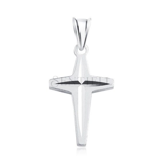 Zawieszka w formie krzyżyka wykonana ze srebra próby 925, o wymiarach ok. 25 x 12 mm i przybliżonej wadze ok. 0,9 g. Ramiona mają zwężający się ku dołowi profil, a na froncie zastosowano diamentowane nacięcia ułożone w osiowy, czteroramienny układ, tworzący wyraźne załamania światła. Powierzchnie boczne są gładkie i polerowane. Element wyposażony jest w smukłą, pionową krawatkę dopasowaną do gabarytów zawieszki. Całość wykończona jest rodowaniem.