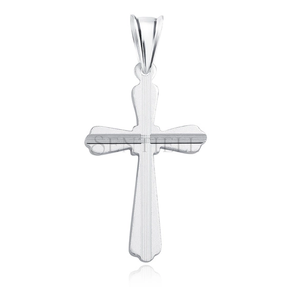 Zawieszka w formie krzyżyka wykonana ze srebra próby 925, o wymiarach ok. 36 x 18 mm i przybliżonej wadze ok. 1,4 g. Ramiona mają profil o lekko rozszerzonych zakończeniach, z obwiednią wykończoną satynowaniem. W centralnej części zastosowano diamentowane nacięcia biegnące osiowo wzdłuż pionowej belki oraz poprzecznego ramienia, tworzące skrzyżowany układ linii. Krawędzie zewnętrzne są gładkie i polerowane. Zawieszka wyposażona jest w pionową, zamkniętą krawatkę dopasowaną do proporcji elementu. Powierzchnia wykończona jest rodowaniem.