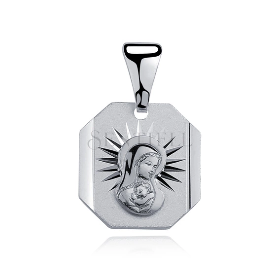 Medalik wykonany ze srebra próby 925 o wymiarach 21 x 13 mm, w ośmiokątnej formie z wyraźnie fazowanymi krawędziami. Centralną część frontu zajmuje relief Matki Boskiej z Dzieciątkiem w ujęciu Madonna, opracowany w wypukłej formie i osadzony na satynowanym tle. Za wizerunkiem widoczny jest motyw promienisty wykonany techniką diamentowania, tworzący kontrast z matową powierzchnią pola środkowego. Obrzeże medalika pozostaje gładkie i polerowane. Całość pokryta warstwą rodu. Zawieszka wyposażona w standardową krawatkę.